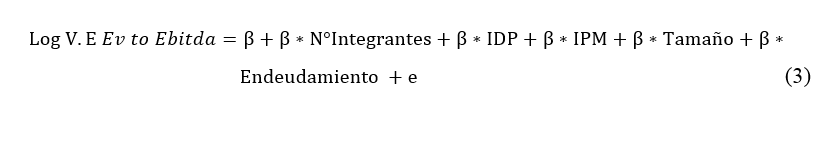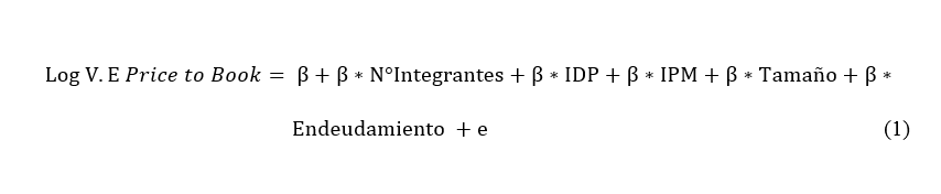 The dependent variable is the firm value, calculated using the multiples method from an emerging market perspective, considering that Chile fits this classification. Three approaches were used: Price to Book (Price/Book value by Industry Group), Price to Sales (Price/Sales ratio by Industry Group), and EV to EBITDA (Enterprise Value/EBITDA by Industry Group). The independent and control variables (see Table 1) are: the number of board members, the Female Participation Index (FPI), the Professional Diversity Index (PDI), and control variables such as company size and debt level.