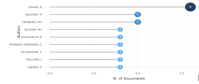 Regarding the most prolific authors on this topic, a total of 1,570 researchers have contributed documents during the studied period (Figure 4). Among them, Professor Rebecca Asare, currently the Director of Programs and Research at the Nature Conservation Research Centre in Accra, Ghana, is considered one of the most important leaders in cocoa agroforestry and is the most prolific author. During the analyzed period, Professor Asare contributed a total of eight documents, published in the last five years.