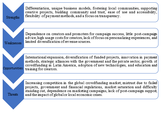 Four risk factors stand out in the external environment. First, international competitive pressure: Kickstarter, Indiegogo and GoFundMe have increased their presence in Latin America, capturing high-profile projects and displacing local market share. Second, regional macroeconomic volatility makes the cost of capital more expensive and reduces the willingness to contribute, affecting the investment variable and the profitability offered. Third, regulatory uncertainty, especially regarding fintech and public offering limits, can raise costs for the entrepreneur and discourage key corporate partners. Finally, reputational erosion associated with isolated frauds and the lack of robust loyalty programs put the online community at risk, decreasing the conversion of successful campaigns (Arjona and Ruiz, 2020). Thus, a summary of the comprehensive SWOT analysis is presented in Figure 1.