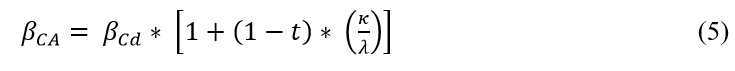 represents the unleveraged accounting beta, while t denotes the organization’s effective tax rate during the fiscal period analyzed. In this context, κ represents the total value of liabilities, and λ refers to the company’s equity value.