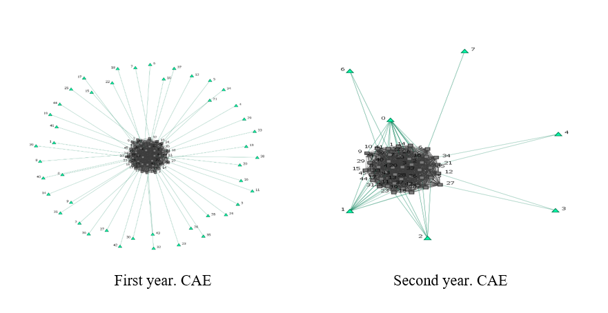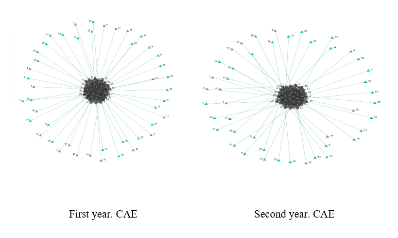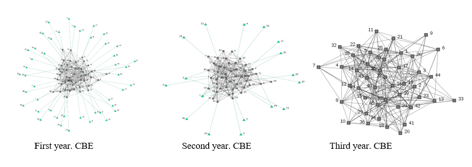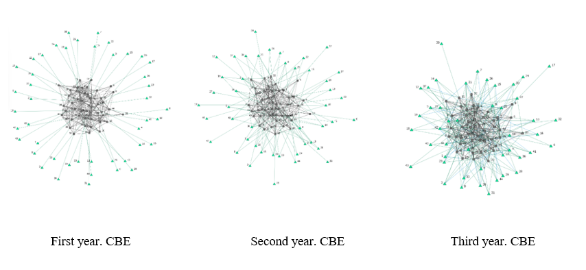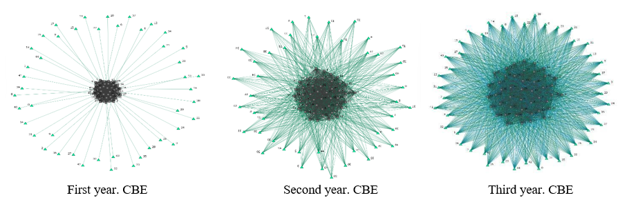 Initially, sharing an idea is positive in the sense that its dissemination can resonate with other companies in the cluster. In the second year, dissemination begins to intensify, increasing the density of the network as more organizations join the knowledge exchange. By the third year, the dissemination process is consolidated, indicating that the idea has circulated effectively throughout the business network (Figure 4).