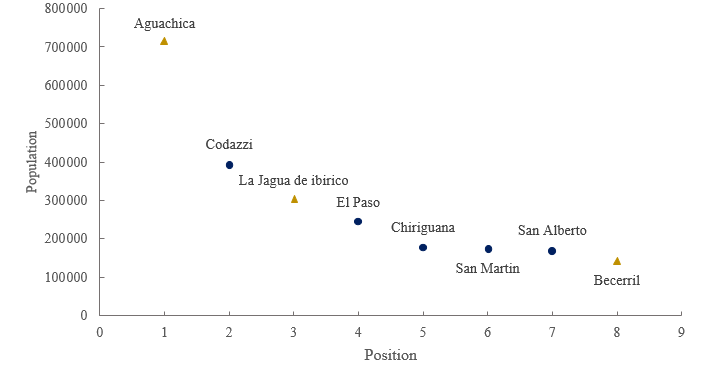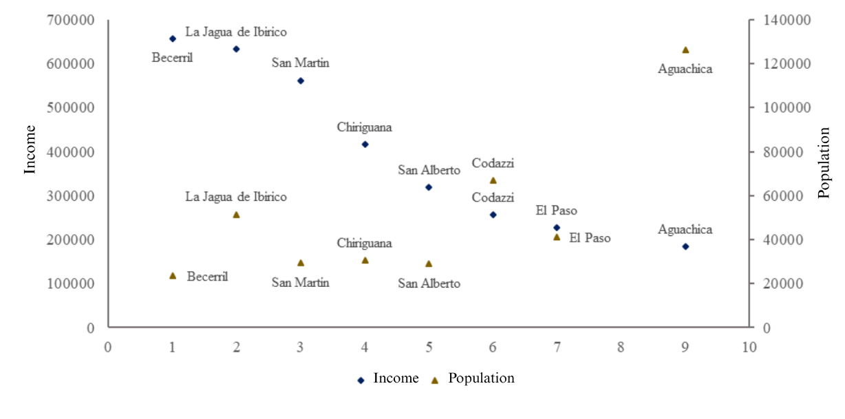 According to Table 1, it is evident that, historically, the territorial entities with the highest generation of own income on average, that is, discounting the items for transfers and subsidies, are the Jagua de Ibirico, Becerril and Aguachica. However, this situation could be related to the population size of each municipality, as illustrated in Figure 4, which presents the cumulative population between 2019 and 2023.