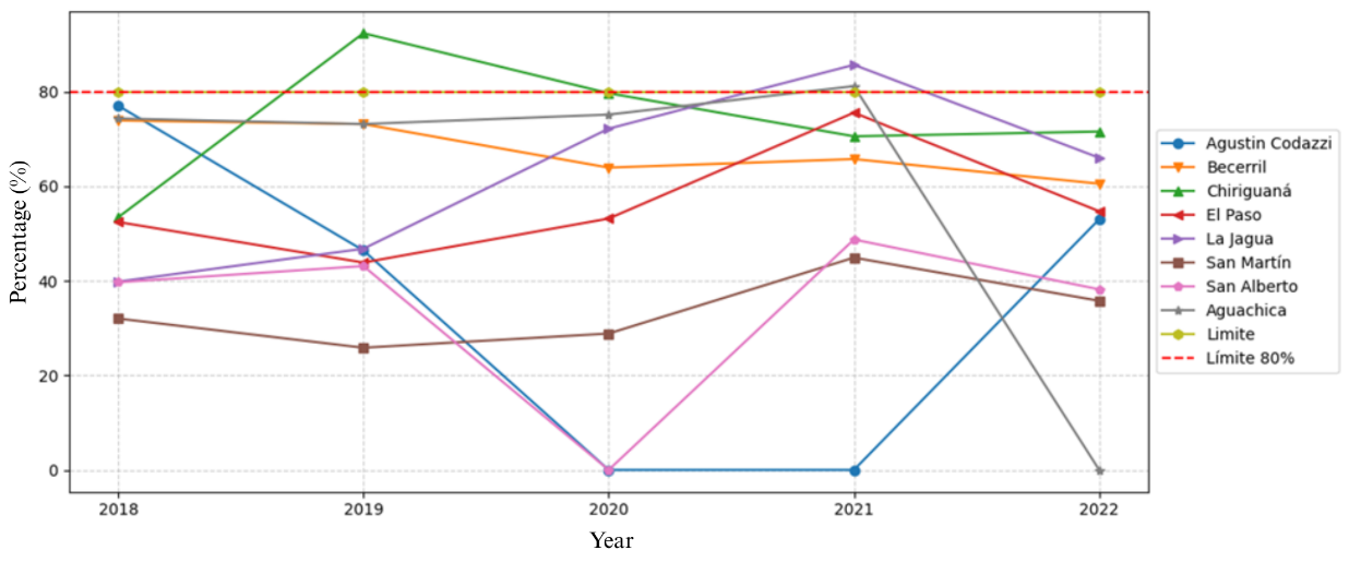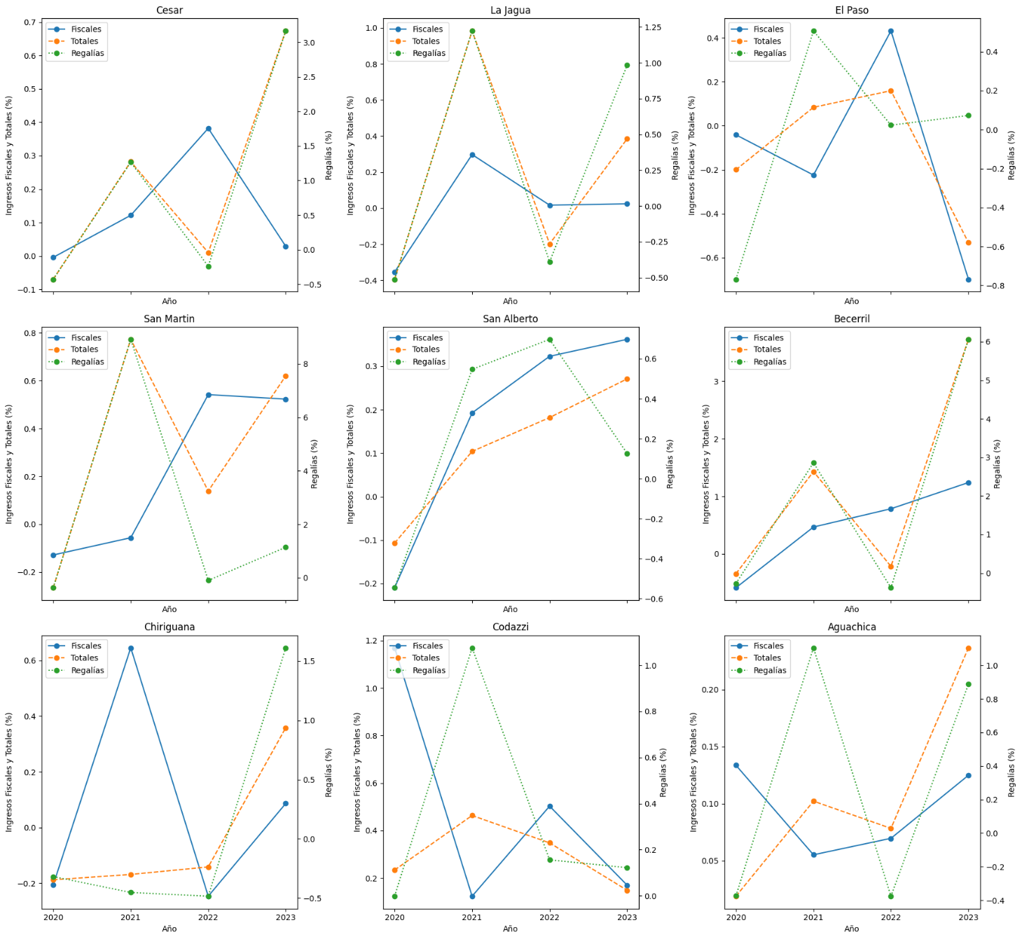 Certainly, royalties represent a special component in terms of compensation for the exploitation of resources in the territories, and the department of Cesar, in Colombia, is one of those that receives the highest compensation per capita for the exploitation of hydrocarbons (Observatorio Fiscal de la Pontificia Universidad Javeriana, 2023). Bonet (2007) pointed out that the departmental government's royalties went from representing 8.7% of its total income in 2000 to 25.8% in 2005. During the study period, the department started with a percentage of 23% and by 2023 it reached 46.7%, maintaining an average of 25.5%.