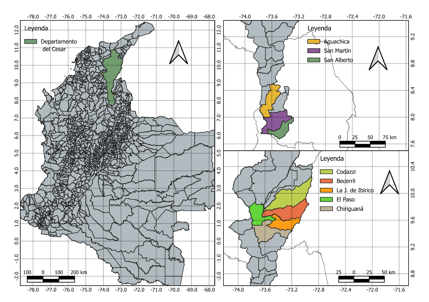 In relation to Figure 1, a geographical representation of the department of Cesar is presented, in which the municipalities included in the analysis are identified. On the left side of the map, the department is delimited in its entirety, while on the right side the municipalities selected for the study are specifically highlighted. In the south of the department are Aguachica, San Alberto and San Martín, while in the north-central area are Agustín Codazzi, Becerril, La Jagua de Ibirico, El Paso and Chiriguaná. This figure allows us to visualize the strategic location of each municipality within the regional context.