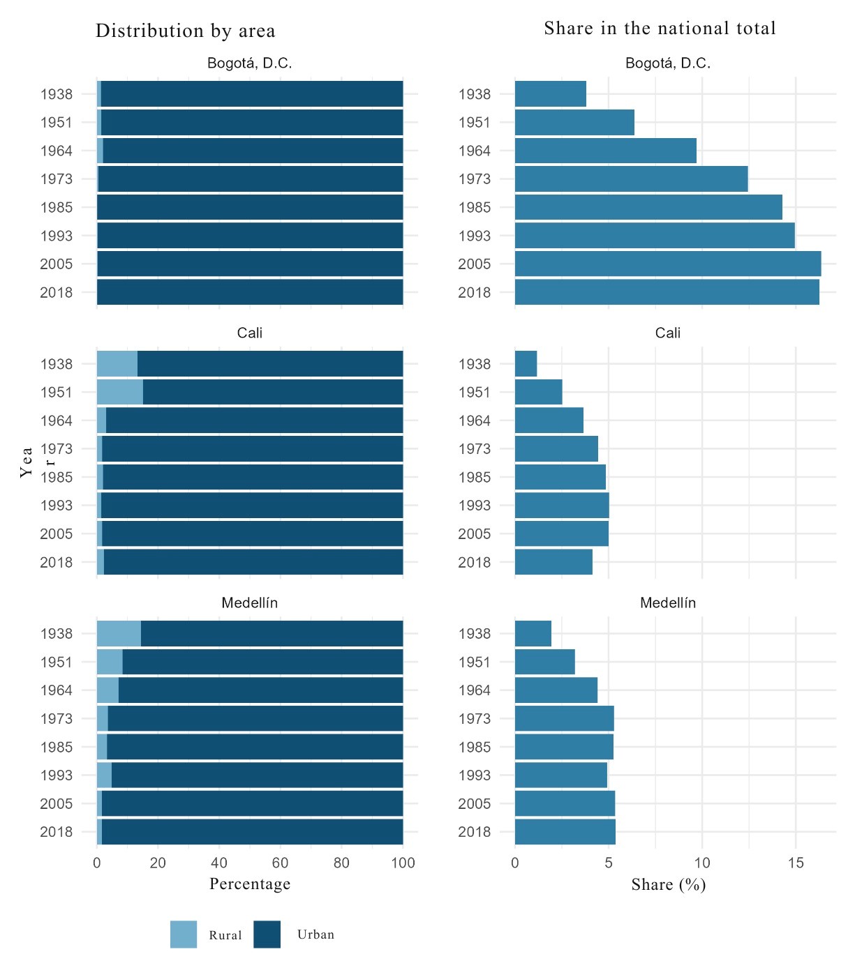 Bogotá, Cali and Medellín: population distribution by geographical area and participation in the national total (1938-2018)