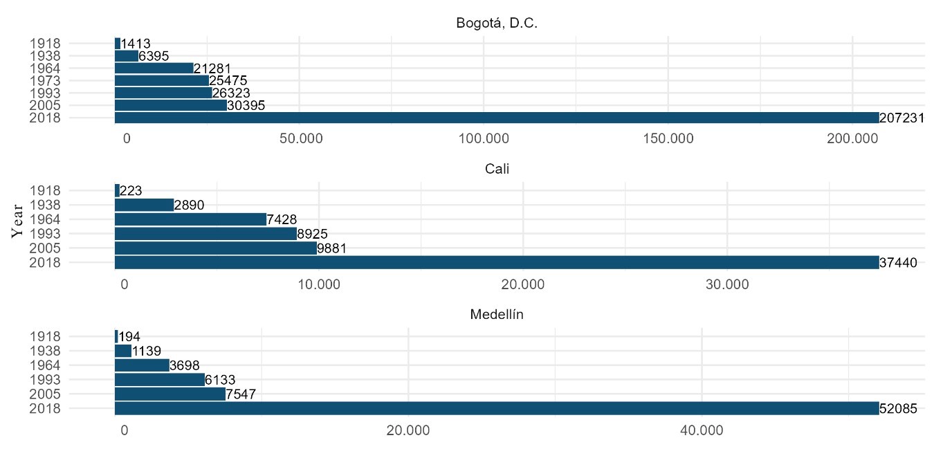 Source: Authors' own elaboration based on publications of the 1918, 1928, 1938, 1951, 1964, 1973, 1985 and 1993 censuses, and processing of the 2005 and 2018 censuses (Republica de Colombia, 1923; Contraloría General de la República, 1930; 1942; and DANE, 1954; 1967; 1980; 1986; 1994; 2024a).