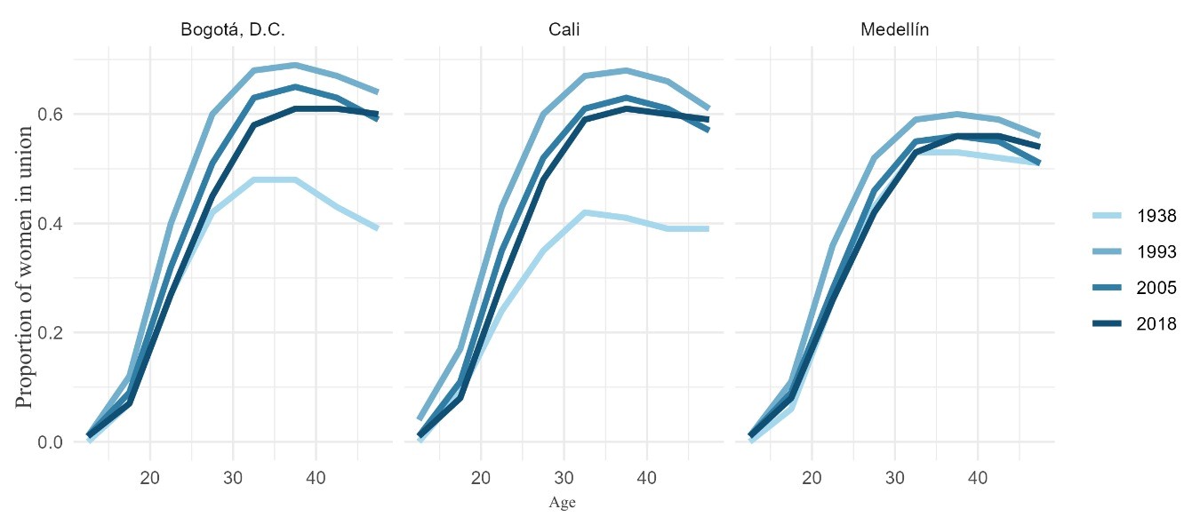 Bogotá, Cali y Medellín: proportion of women in unions of reproductive age. (1938-2018)