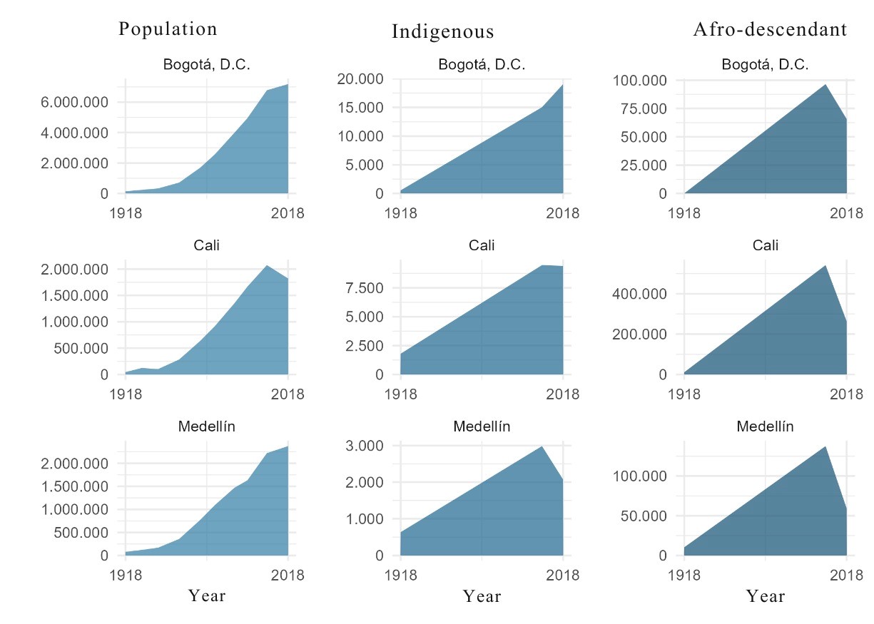 Bogotá, Cali, and Medellín: total population and presence of afro-descendants and indigenous populations recorded in censuses (1918–2018)