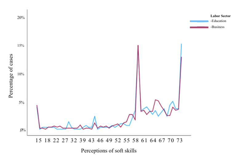 Additionally, Figure 1 shows the distribution of soft skills scores for workers in both sectors. The horizontal axis displays the total score for the variable, consisting of 15 items (on a 5-point Likert scale, where 1 = strongly disagree, 2 = disagree, 3 = neither agree nor disagree, 4 = agree, 5 = strongly agree), with a possible range between 15 and 75 points. The vertical axis shows the percentages of cases corresponding to each value. It can be observed that in both education and business, high perceptions of soft skills predominate, with minimal differences. This supports the homogeneity observed in the results of the specific dimensions.