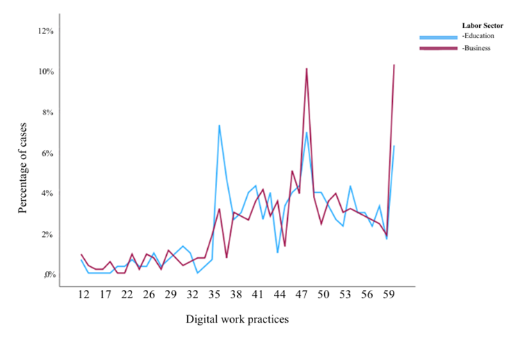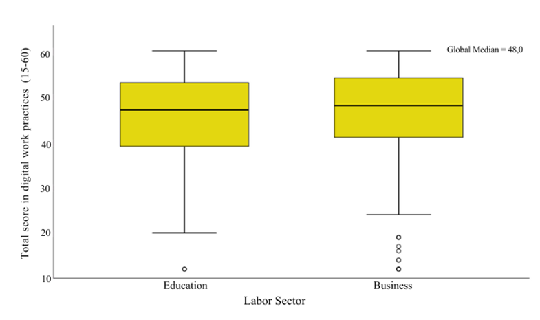 Similarly, Figure 2 shows the distribution of total scores in digital work practices, based on 12 items, with a possible range between 12 and 60. The trend reflects a concentration in the middle and high values of the scales, in both the education and business sectors, reflecting consistent integration of digital tools in work activities, with no significant differences between sectors.
