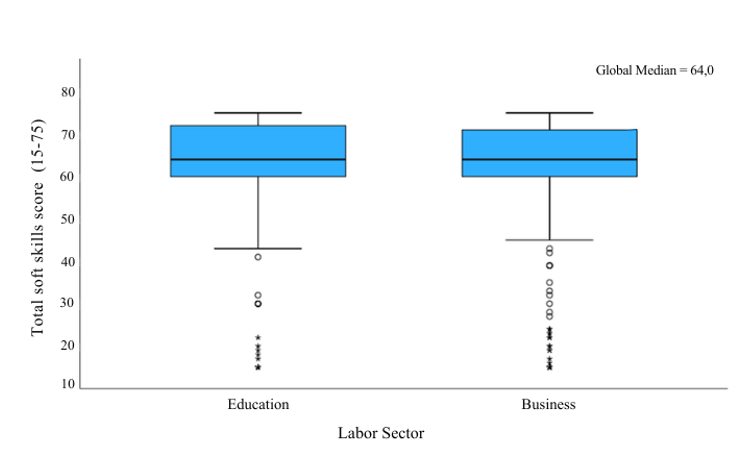 In the statistical analysis, frequencies and percentages were calculated, classifying the results into three levels (low, medium, and high) according to the possible response ranges. Total scores were also obtained for each variable and visualized using box and whisker plots, which allowed for the identification of central tendencies, dispersion, and outliers. Since the distributions did not show normality, nonparametric tests (median and Mann-Whitney U) were used to compare differences between the education and business sectors. Significance values were reported directly without correction for multiple comparisons. Thanks to this methodological approach, it was possible to describe how Ecuadorian workers in both the educational and business sectors perceive their soft skills and the use of digital tools in their work environment.
