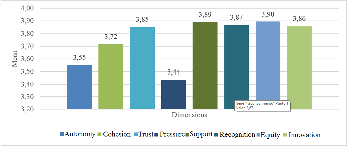 Figure 1 shows the means for each dimension of OC, where the equity dimension stands out above the others (m=3.90), followed by support in second place (m=3.89) with a difference of 0.03 compared to recognition. The dimension with the lowest mean is pressure (m =3.44), while the rest of the dimensions range from 3.55 to 3.86.