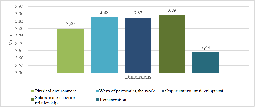 Figure 2 shows the averages for each dimension of job satisfaction, with the subordinate-superior relationship dimension standing out (m = 3.89), and minimal differences between the dimensions of ways of performing the work (m = 0.01) and opportunities for development (m = 0.02); however, the dimension with the lowest mean is remuneration, while the physical environment dimension ranked fourth.