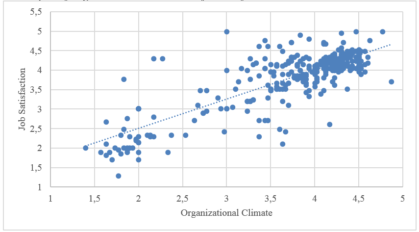 Figure 3 shows the scatter plot that demonstrates the positive relationship between organizational climate and job satisfaction, supporting the idea that the better the perception of the organizational climate, the higher the levels of job satisfaction. Most of the points are between 3.5 and 4.5 for both variables.