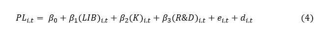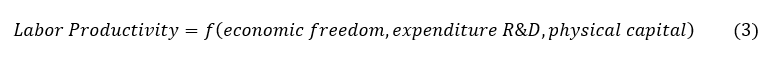 According to this equation, the labor productivity of a country depends positively on the degree of economic freedom, R&D spending, and physical capital. Both economic freedom and R&D spending influence productivity through progress or technological innovation.