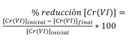 Las muestras de agua del colector Juan 23, fueron analizadas usando el método de la 1,5-difenilcarbazida, a cada alícuota de 5 mL de muestra diluida (factor de dilución 1/100) y tomada por triplicado cada 12 h, se adicionó H2SO4, H3PO4 y 1,5 difenilcarbazida, se homogenizó y se dejó reposar hasta obtener el desarrollo del color rojo violeta característico de la formación del complejo; consecutivamente, se determinó la concentración de Cr (VI) y el porcentaje de reducción, usando la ecuación de la recta obtenida de la curva de calibración y la ecuación 118, respectivamente. Teniendo en cuenta los resultados obtenidos en esta fase, se graficó la cinética de reducción de las tres bacterias y se seleccionó el aislado bacteriano que presentó mayor porcentaje de reducción de Cr (VI)16.