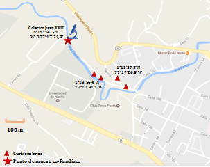 La ciudad de San Juan de Pasto posee varios puntos de vertimiento al Río Pasto, uno de ellos es el colector Juan 23 ubicado en el sector Torobajo donde se obtuvieron las muestras de agua residuales objeto de esta investigación (Pandiaco, N: 01°14' 5,1'', W: 077°17' 35,9'') entre el mes de octubre y noviembre de 2015 (Figura 1). El agua se transportó en recipientes plásticos de 20 L, fue filtrada previo a su uso con algodón, gasa y un tamiz N° 200 para evitar el ingreso de partículas gruesas. La muestra se diluyó en agua tamponada a pH 7,0 (Solución Salina Amortiguada por Fosfatos, PBS) en una proporción 50:50, esterilizada previamente y suplementada con 59 mg/L de dicromato de potasio. La esterilización del agua se realizó usando una autoclave a 121 °C durante 15 minutos, procedimiento que se repitió por duplicado cada 24 horas.