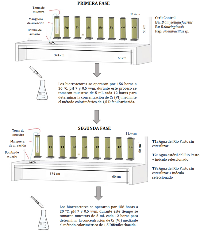 Como unidad experimental se emplearon biorreactores de 60 cm de largo por 11,4 cm de diámetro. En la primera fase de la investigación se realizaron dos réplicas biológicas de cada bacteria (B. amyloliquefaciens, B. thuringiensis y Paenibacillus sp.), las cuales presentaban a su vez tres réplicas técnicas; los biorreactores se operaron por 156 h, tiempo en el cual se tomaron muestras de 5 mL cada 12 horas para la determinación de Cromo hexavalente. En la segunda fase de la investigación se trabajó con el modelo seleccionado en la fase anterior y se realizaron tres replicas biológicas de cada tratamiento (agua sin esterilizar del Río Pasto; agua estéril del Río Pasto inoculada con B. thuringiensis y agua sin esterilizar del Río Pasto inoculada con B. thuringiensis), con tres replicas técnicas cada uno; de igual manera, los biorreactores se operaron por 156 h, tiempo en el cual se tomaron muestras de 5 mL cada 12 horas para la determinación de Cromo hexavalente (Figura 2).