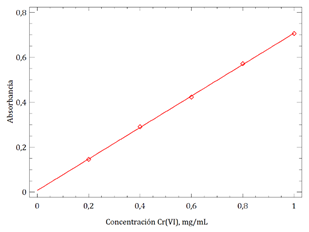Para cuantificar la reducción de Cromo de los aislados bacterianos en las muestras se realizó una curva patrón, para ello se analizaron químicamente cinco soluciones patrón usando el método de la 1,5-difenilcarbazida, el cual contempla que a cada solución se le adicione 2 gotas de ácido sulfúrico (H2SO4) al 20%, 2 gotas ácido fosfórico (H3PO4) al 80% y 2 mL de solución de 1,5-difenilcarbazida (((C₆H₅)NHNH)₂CO) al 85% disuelta en acetona. La absorbancia de todas las soluciones patrones fue tomada a una longitud de onda de 543 nm, se usaron celdas de vidrio de paso óptico de 1 cm y posteriormente se analizó la correlación por mínimos cuadrados entre la absorbancia y la concentración usando el programa estadístico Statgraphics Centurión XVI de libre acceso. La solución patrón más concentrada, 100 mL, fue preparada usando 1 mL de una solución madre de Cromo (VI) (0,142 g de dicromato de potasio anhidro en 100 mL de agua desionizada) y a partir de esta solución patrón se realizaron cinco diluciones patrón de 25 mL de concentraciones entre 0,2 y 1 mg/L de Cr(VI). El análisis químico de las cinco soluciones patrón fue llevado a cabo usando el método de la 1,5- difenilcarbazida, adicionando H2SO4, H3PO4 y 1,5 difenilcarbazida se homogenizó, se dejó reposar hasta obtener el desarrollo del color característico del complejo formado y se determinó la absorbancia de todas las soluciones patrones16.