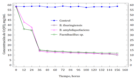 Para realizar estudios sobre la influencia de la presencia del inóculo bacteriano en una muestra de agua de Río Pasto, se seleccionó la especie bacteriana B. thuringiensis dado que fue el aislamiento bacteriano que presentó mayor porcentaje de reducción; esto se debe probablemente a que la bacteria presenta un metabolismo anaerobio facultativo y quimiorganotrofo, características que facilitan la adaptación a las condiciones del proceso de fermentación y favorecen el mecanismo de reducción27. En cuanto al tratamiento control empleado para este proceso (Figura 3) se observó que la concentración de Cr (VI) inicial, no varió significativamente en todo el proceso, indicando de cierta manera, que las bacterias empleadas en el tratamiento son las responsables de la reducción de este metal; aparentemente, ningún otro compuesto del medio o sustrato empleado actúa como agente reductor.