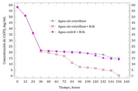 El tratamiento con mayor porcentaje de reducción de Cromo hexavalente, en un periodo de 156 h, fue el tratamiento tres (99,42%) debido a que, las condiciones establecidas dentro del biorreactor probablemente favorecieron el establecimiento de asociaciones entre B. thuringiensis y organismos afines presentes en el agua. Observaciones similares fueron reportadas por Muneer et al., quienes evaluaron individualmente y en combinaciones diferentes, la reducción de Cr(VI) de tres microorganismos (B. thuringiensis, Candida etschellsii y Stylonychiamytilus) aislados de aguas residuales industriales, con un porcentaje de reducción del 82%, 80%y 60% para bacteria, levadura y protozoo, respectivamente. La combinación de los tres organismos presentó un porcentaje de reducción de 90% a las 96 h, concluyendo, que este tipo de consorcios o asociaciones favorece la reducción de este metal28.