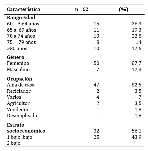 La muestra de estudio estuvo conformada por 57 individuos con una edad promedio de 69 años aproximadamente con una desviación estándar (DS) de 9,3 años; el 26,3% de la población se encuentra entre los rangos de edad de 60 a 64 años. La mayoría de las personas son amas de casa y más de la mitad de la población pertenece al estrato socioeconómico 1 (Tabla 1).