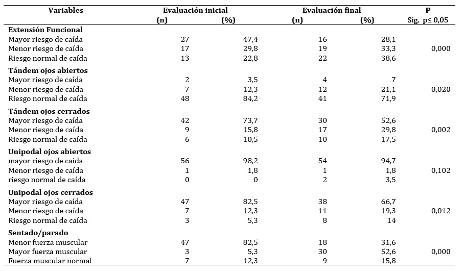 El riesgo de caídas de la evaluación inicial y final, de las diferentes pruebas de evaluación aplicadas, presentó diferencias numéricas que permiten demostrar que hay cambios positivos en el equilibrio y fuerza muscular de miembros inferiores después de aplicado el programa de actividad física (Tabla 2).