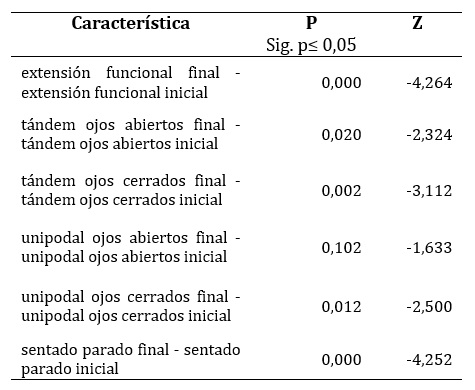 Las pruebas que presentaron significancia estadística fueron extensión funcional, tándem ojos abiertos y cerrados, unipodal ojos cerrados y sentado parado, los resultados de unipodal ojos abiertos sólo presentaron cambios numéricos positivos. De igual forma, los hallazgos descritos en éste trabajo son similares con los resultados de estudios realizados sobre estos parámetros en países como Canadá y Francia23, y se han logrado efectos más notables comparado con estudios que cuentan con esquemas de entrenamiento afines26,28,29.
