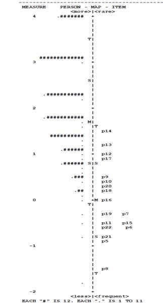 En la Figura 2, se muestra también el mapa de Wright para analizar sobre la misma escala de medición, que va de -3 a 4 lógitos, el comportamiento del nivel de dificultad de los ítems -lado derecho- y la capacidad de los escolares para responder el instrumento -lado izquierdo de la misma.