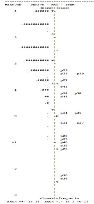 El mapa de Wright, Figura 1, permite formar una idea visual sobre los niveles de dificultad de los ítems y el grado de habilidad de los estudiantes al responderlos, observando estos resultados en la misma escala de medición, una de las grandes ventajas que ofrece el modelo de Rasch, que en nuestro caso va de -2 a 4 lógitos. La distribución de ítems y escolares se observan como dos histogramas verticales: los ítems al lado derecho identificando el número correspondiente del mismo en el instrumento o encuesta y se distribuyen desde los más fáciles en la parte inferior hasta los más difíciles en la parte superior de la escala; al lado izquierdo se observa el comportamiento de los escolares, donde los símbolos "#" y "." equivalen a un número determinado de personas, los cuales se especifican al final del mapa respectivo, y permiten identificar visualmente donde se ubica la mayor cantidad de escolares así como donde están los más hábiles o capaces de responder - en la parte superior - y los menos hábiles - en la parte inferior de la escala.
