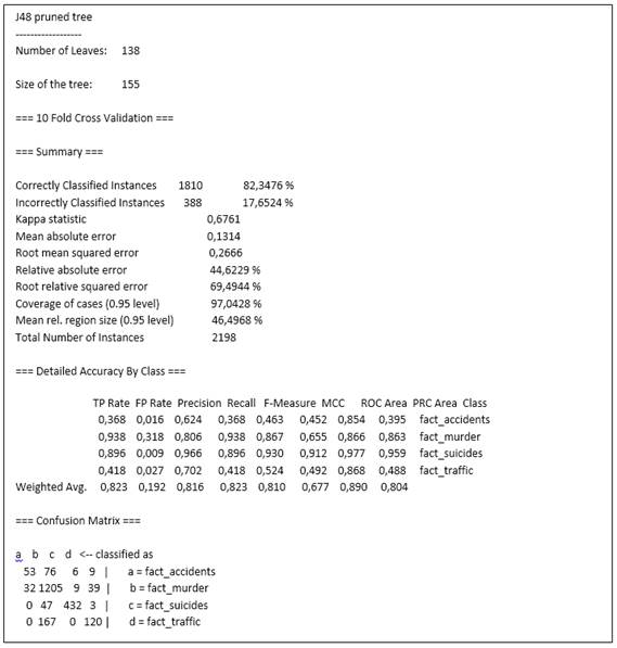 Analizando los resultados de las pruebas de clasificación con árboles de decisión realizadas con el conjunto de datos de lesiones fatales T2198A12, en el cual se almacenan los datos de 2198 casos de muertes fatales distribuidos en homicidios: 1285; suicidios: 482 casos; accidente de tránsito: 287 y muertes no intencionales: 144, se puede observar que el árbol de decisión construido con un factor de confianza C=0,5 y un número de casos por nodo M=8 es el mejor (Figura 2), con 1810 instancias correctamente clasificadas, que corresponden a un porcentaje de precisión del 82,35% y 388 instancias incorrectamente clasificadas, correspondiente a un porcentaje de error del 17,65%.