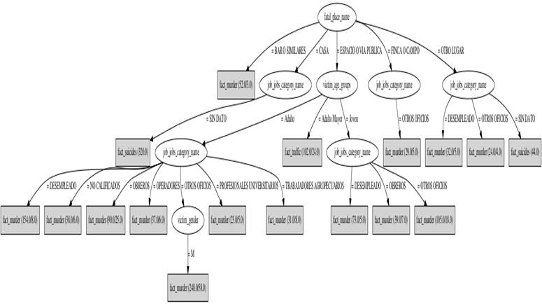 Con el fin de descubrir patrones delictivos de muertes por causa externa, se seleccionó el modelo de clasificación basado en árboles de decisión. La clasificación con árboles de decisión considera clases disjuntas, de forma que el árbol conducirá a una y solo una hoja, asignando una única clase a la predicción22. Después de construido el modelo servirá para determinar en nuevos casos, el tipo de delito que causó la muerte19,20. Para esta tarea, se escogió como clase el atributo Injury que determina si la muerte fue por un homicidio, un accidente de tránsito, un suicidio o una muerte no intencional.