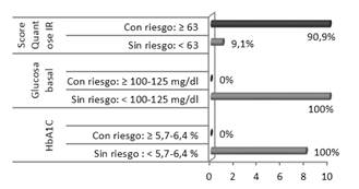 Por el contrario el test de metabolómica Quantose IR © , detectó 10 sujetos con resistencia a insulina tras el análisis del algoritmo de los 4 metabolitos y el resultado de su score (>63), Quantose IR © : 78,09 ± 9,25 (Figura 1).