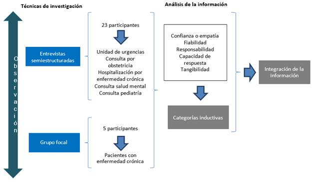 Las estrategias de recolección de información desarrolladas fueron: entrevistas semiestructuradas y un grupo focal para explorar las percepciones sobre la calidad en los servicios de atención en salud teniendo en cuenta las cinco dimensiones propuestas por Parasuraman et al., Confianza, Fiabilidad, Responsabilidad, Garantía y Tangibilidad13. En la Figura 2 se esquematiza el proceso metodológico.