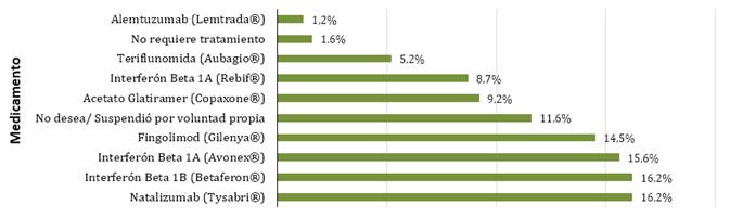 La EMRR tuvo una prevalencia del 82,1%, EMSP del 14,5% y EMPP del 3,5%; el 73,4% no presentaron ninguna recaída en el último año. Se encontró que 11,6% no utilizaban ningún medicamento inmunomodulador por decisión propia. Dentro de las manifestaciones clínicas que presentaron los pacientes en el último mes, los más frecuentes fueron la fatiga (71,7%) y los síntomas sensitivos (54,3%), el 91% de los pacientes tenían riesgo de depresión; se presentaron síntomas motores en el 40,5%, síntomas del tronco encefálico en el 27%, alteraciones visuales 31,8%, dolor 37%, alteración en el control de esfínteres 45,7%, trastornos cognitivos 35,3% y alteraciones sexuales en 19,7%. Además del medicamento inmunomodulador (Figura 1), el 42% utilizaba medicamentos para dolor, 34,1% antidepresivos, 20,8% medicamentos para la fatiga, 11,6% medicamentos para espasticidad, 8,7% usaba fampridina para mejorar la marcha y 8,1% medicamentos para manejo de síntomas urinarios.