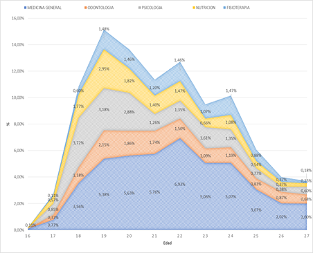 En la Figura 1 se muestra distribución de la edad de esta población respecto a la utilización de los servicios asistenciales.