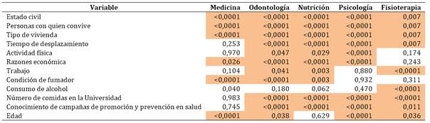 Se observa que el estado civil, las personas con quienes convive el estudiante y el tipo de vivienda son variables influyentes en la utilización de todos los servicios. En particular la condición de soltero en una variable que ha sido reportada en la literatura como muy influyente en el desarrollo de la vida universitaria en Bogotá14. Con respecto a la misma prueba se evidencia un grado de importancia menor de las variables tiempo de desplazamiento, número de comidas realizadas en la Universidad, el conocimiento de las campañas de promoción y prevención de salud y la edad porque resultaron ser dependientes con un número menor de servicios. Por último, se observa que variables como el consumo de alcohol o la realización de actividad física son menos influyentes en la utilización de los servicios asistenciales en la Universidad.