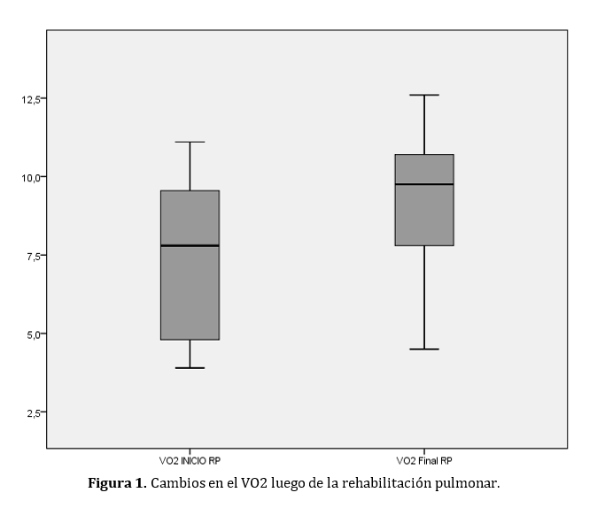 Tal como se evidencia en literatura actual, la fisiopatología de la EPOC consiste básicamente en cambios inflamatorios y fibróticos con alteraciones estructurales que se evidencian en la limitación al flujo aéreo que no es totalmente reversible, esto se observa en pruebas como la espirometría en la cual la relación de VEF1/CVF postbroncodilatador es < al 70%(1); en el presente estudio los valores promedio fueron de 62, y en el de Agusti et al.(22) aún más bajos con promedio de 44,8 ± 11,6. Estos resultados coinciden además con la investigación de Cote et al.(23) los cuales no encontraron cambios significativos en VEF1 después de realizar RP.