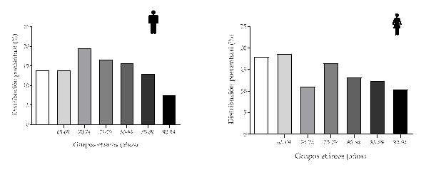 La muestra estuvo conformada por 253 adultos, 108 (42,7%) hombres y 145 (57,3%) mujeres, entre los 60 y 94 años de edad, distribuidos en cinco grupos etarios de la siguiente forma: 60-64 (n=41), 65-69 (n=42), 70-74 (n=37), 75-79 (n=42), 80-84 (n=36), 85-89 (n=32) y 90-94 (n=23) y según género como se observa en la Figura 1.