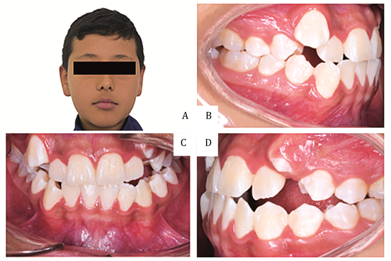 Estudio de caso de un sujeto masculino de 11 años de edad, remitido del servicio del posgrado de ortodoncia por posible alteración postural. El participante registraba antecedentes médicos de respiración oral desde los 9 años; rinitis y alergia al polvo desde los dos años y estrabismo. En el momento del examen no estaba medicado. Se observó una relación molar de Angle Clase I bilateral, canina Clase II, over jet de 1 mm, over bite del 25%, línea media inferior desviada a la izquierda, perfil recto y proquelia, como se observa en la Figura 1.