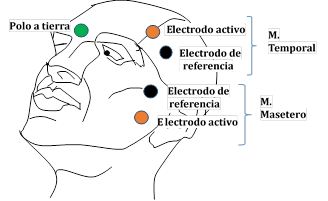 Para el registro de la actividad eléctrica de los músculos orofaciales (sEMG) se realizó una electromiografía de superficie22, para lo cual se utilizó un equipo Biometrics DataLog MWX8®. El electromiógrafo detectó el potencial eléctrico generado por las células musculares, cuando estas células se activaron neurológicamente al masticar. Los electrodos se posicionaron de la siguiente manera: para los maseteros y temporales: se solicitó al sujeto realizar un cierre dentario con máxima fuerza, se palpó el músculo masetero y el músculo temporal, un electrodo activo se ubicó en el punto motor y un electrodo de referencia fue ubicado 1 cm por debajo (Figura 2).