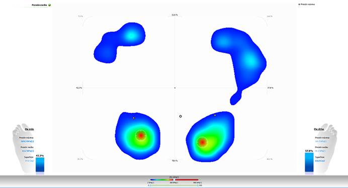 A nivel de estabilometría, el Índice de Romberg fue de 1,22, indicando alteración en la estabilidad estática30. En la distribución de las presiones plantares se observó mayor presión plantar en el pie derecho (57,8%) vs pie izquierdo (42,2%) y mayor presión a nivel de retropié bilateral como se observa en la Figura 3.