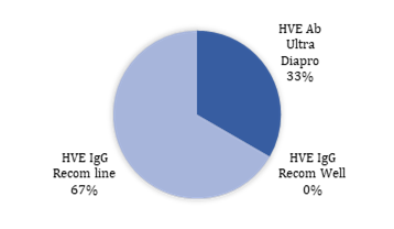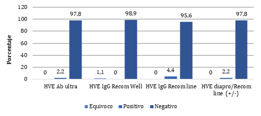 De los 90 sueros evaluados, la técnica de ELISA de anticuerpos totales ELISA IgG anti HVE Recom Well marca Mikrogen identificó 2 sueros positivos (2,2%), la Prueba ELISA IgG HVE versión ULTRA® marca Diapro evidenció una muestra equivoca (1,1%). La prueba western blot Recom line HVE marca Mikrogen detectó 4 muestras positivas (4,4%).