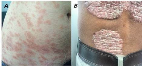 Dentro de las manifestaciones dermatológicas más usuales en los 6 casos reportados están: exantema, roséola, vesículas, nevus rubí e hiperqueratosis, las cuales se han relacionado con la actividad del HHV-6 en diversos estudios3. En la revisión realizada por Wolz et al., reportan que lesiones cutáneas clasificadas en exantema súbito, pitiriasis rosada, liquen plano, púrpura trombocitopénica idiopática, púrpura fulminante, alergia a medicamentos, síndrome de Stevens-Johnson y Gianotti-Crosti, están altamente relacionadas a la reactivación viral por HHV-6 y HHV-73.