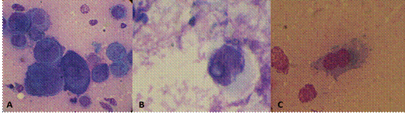 Paciente masculino de 67 años, mestizo, procedente de Popayán (Cauca), pintor, sin antecedentes personales relevantes. Refiere en los últimos 6 meses presencia de múltiples episodios eméticos y diarreicos, sensación de decaimiento, problemas de memoria y concentración, dolor fibromuscular asociado a manifestaciones cutáneas como pápulas y puntos rubí, a nivel ocular, el paciente refiere presentar irritación en varias ocasiones, además de presentar parestesias tipo prurito en región de areola. Al examen físico presencia de alteraciones dermatológicas tipo lunares rojos y puntos rubíes en región de tórax y región dorsal generalizados. Los exámenes de laboratorio muestran anticuerpos IgG contra HHV 6 positivos, carga viral por qPCR para HVH 6 positivo y test de Tzanck positivo (Figura 2C) (Tabla 1).