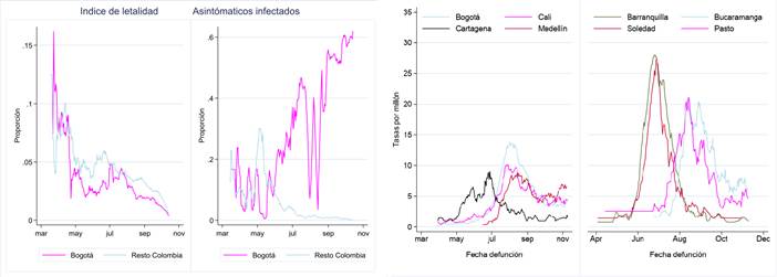 Hay variación entre las ciudades en la magnitud del pico y la velocidad de ascenso y descenso de las curvas de las tasas de mortalidad por COVID-19. En Bogotá, Cali, Medellín y Cartagena el impacto de la pandemia fue menor con una velocidad gradual de ascenso y descenso. En Barranquilla, Pasto, Bucaramanga y Soledad las curvas se caracterizaron por ascensos y descenso rápidos que se relacionaron con más muertes durante el pico de la pandemia de COVID-19.