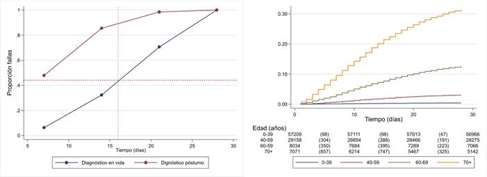 En Colombia hay demora en el diagnóstico y retardo en la notificación de la infección por SARS-Cov2 en quienes fallecen por COVID-19. El 55,2% fueron diagnósticos póstumos y en este grupo la mitad murieron durante la primera semana de iniciados los síntomas y el 97% en los primeros 21 días. Cuando el diagnóstico se hizo en vida, en la primera semana murieron el 3,5% y la mitad de los pacientes en el día 16 (Figura 2A).