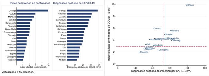 Colombia durante la pandemia por COVID-19. Diagnóstico póstumo de infección por SARS-CoV2 en relación con el índice de letalidad en casos confirmados de COVID-19. La región Caribe tuvo las tasas diarias de mortalidad más alta, mayor proporción de diagnósticos póstumos y valores más altos del índice de letalidad que las ciudades del centro y suroccidente. La línea roja indica el promedio nacional.