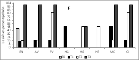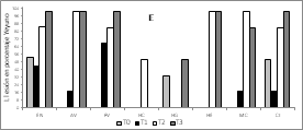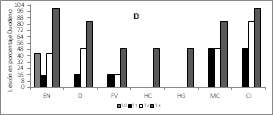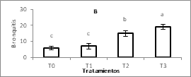 En la Figura 2A, 2B y 2C se observan los hallazgos histopatológicos encontrados mediante las tinciones. Se identificó lesiones entero necróticas (EN) en todos los tratamientos, sin embargo, el tratamiento T3 (L. plantarum sin microencapsular) presentó estas lesiones en el 100% de las muestras. La atrofia de vellosidades (AV) no se presentó en el control (T0), pero sí en los demás tratamientos, con un valor muy elevado en el tratamiento T3. La fusión de vellosidades (FV) y el conteo de caliciformes fueron mayores en el tratamiento T3. Las lesiones más representativas están en el tejido de las aves que fueron alimentadas con L. plantarum, lo que indica que se deben completar los estudios en la cantidad suministrada y el ajuste del inóculo agregado en el alimento de los pollos.
