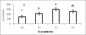 T0: dieta comercial sin aditivos, T1: dieta comercial con probiótico comercial, T2: dieta comercial con inclusión de L. plantarum microencapsulado, T3: dieta comercial con inclusión de L. plantarum sin microencapsular. Letras distintas en la fila muestra diferencias significativas, (p<0,05).